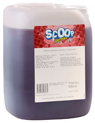Indhold: 5,00 l Alkohol: 0,00 % Land: Danmark Skab selv slushice eller læskedrik med den velkendte smag af den klassiske børnefavorit, astronaut-is. Alle Scoop varianter er fri for Azo-farvestoffer og kan derfor serveres til børn. Scoop koncentraterne leveres i praktiske 10 liters dunke. Der bliver 30 liter slushice af en dunk (opblandet 1+5) eller 45 liter læskedrik (opblandet 1+8). Scoop koncentrat findes i en række populære og velsmagende varianter, i flotte farver.